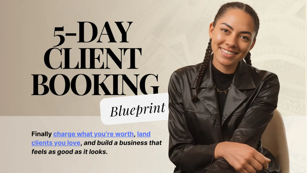 The 5-Day Client Booking Blueprint gives you the exact system we used to scale from $500 shoots to $15K brand campaigns—fast.